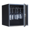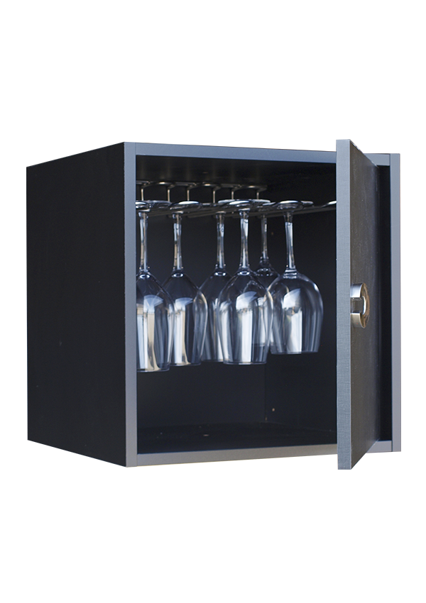 El cubo con soporte de copas y puerta Merlot es fabricado con compuesto de madera forrado de melanina 16mm negra tipo soft, se entrega montado y en caja individual.